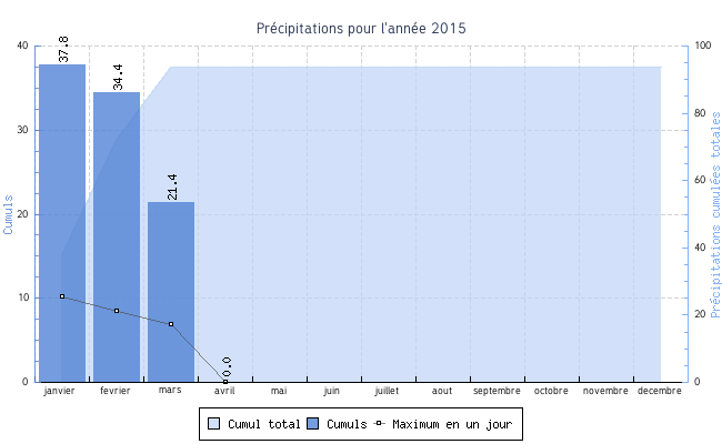 | janvier | -3.8 °C | 3.1 °C | 14.4 °C | 9.4 °C | 6.0 °C | 2.9 km/h | 36.0 km/h | O |